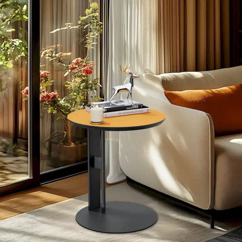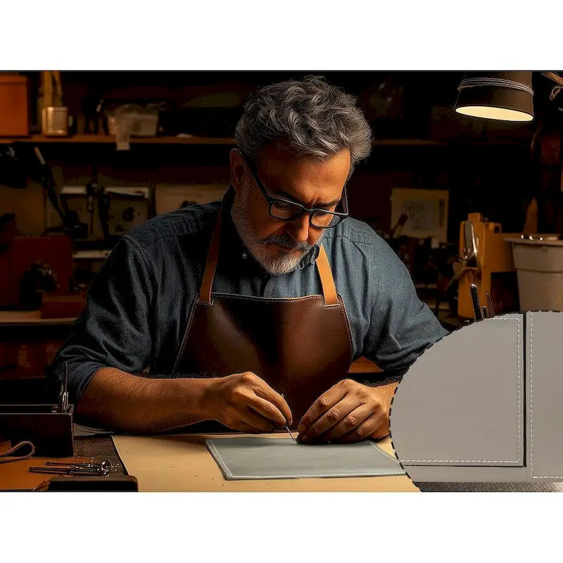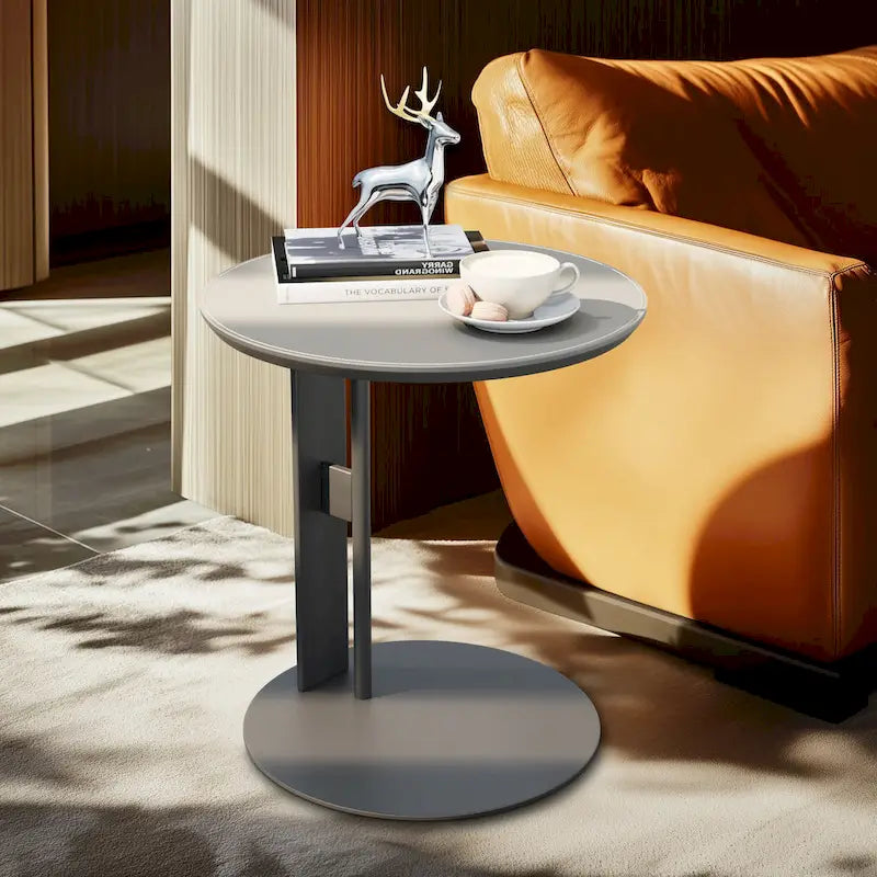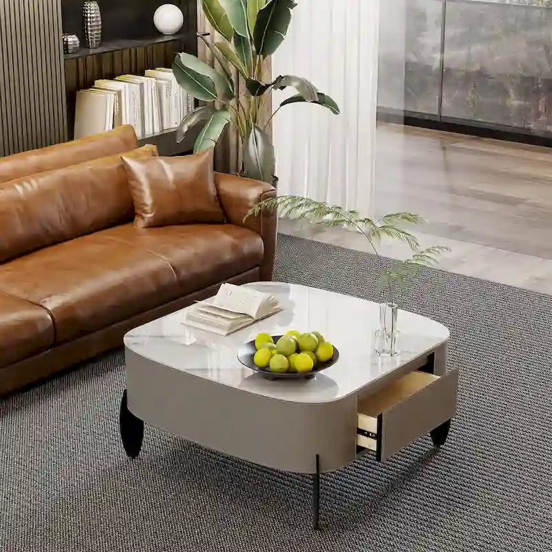 Modern square coffee table with sintered stone top and 2 drawers. Features microfiber saddle leather side panels and metal legs.